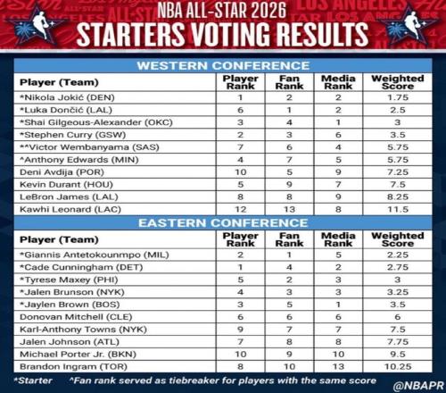 算上球员投票,球员投票詹姆斯是第八,球迷投票第八+球员投票第八,最终詹姆斯排在西部第九的位置无缘全明星先发,而湖人的东契奇球迷投票第一+球员投票第六最终排名是第二。