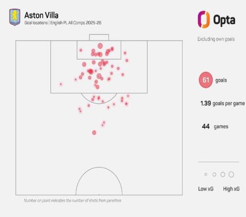 维拉本赛季在44场各项赛事中打入了61球,而下图统计了维拉本赛季所有联赛进球的射门位置分布,其中圆圈越大,代表该射门的预期进球越大。